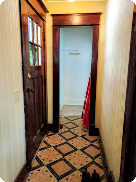 This is our front entry way. We've knocked out the front hall closet and the closet in the front bedroom. They were back to back. That way we can use the closet doors as entry doors. Way less construction and demo than if we'd bashed in a wall.